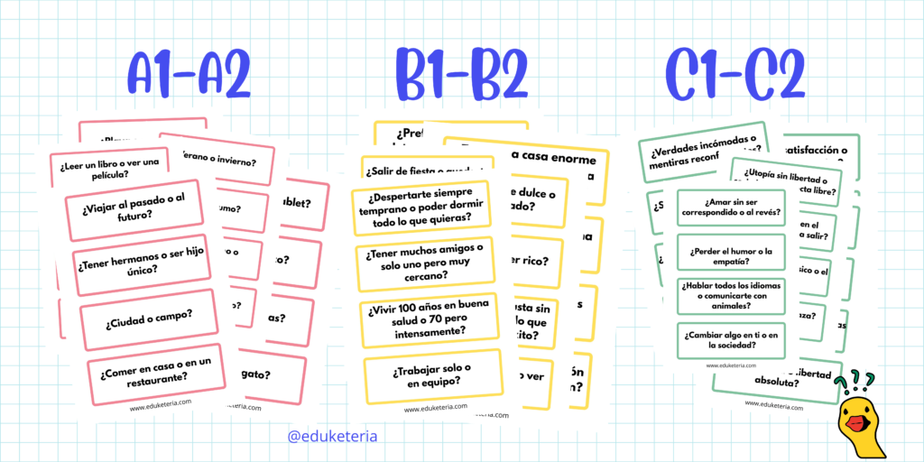 🎉 Un juego de 60 tarjetas con preguntas tipo “¿Esto o lo otro?”, clasificadas por niveles (A1-A2, B1-B2, C1-C2), ¡listas para imprimir y usar en clase!